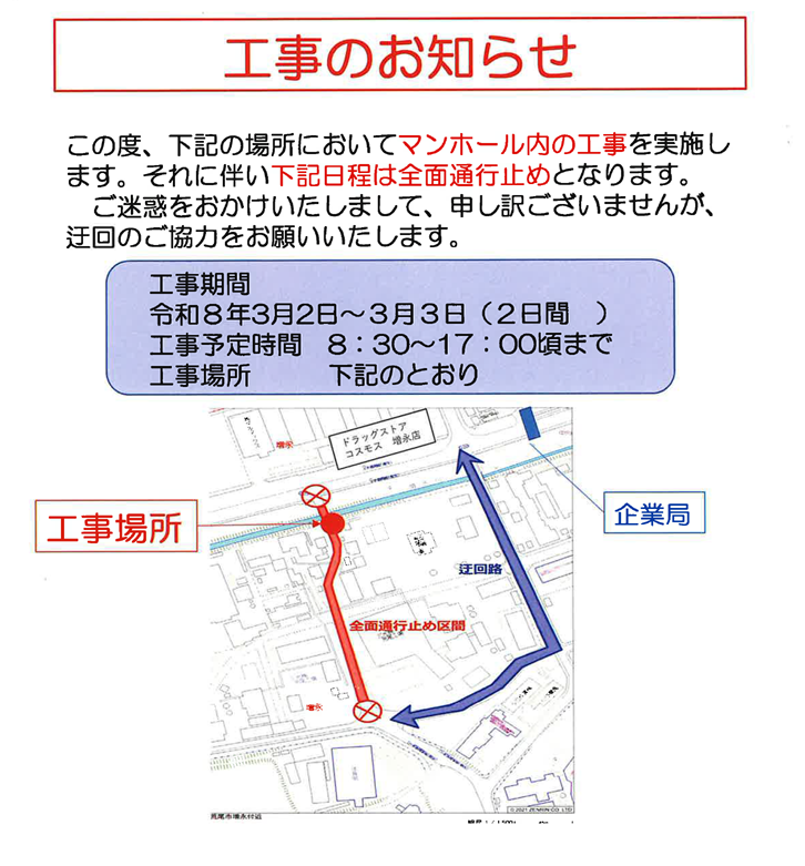 3月2日(月)~3日(火)に本校正門付近の道路工事が予定されています。両日とも8時30分から17時頃までが通行止めとなりますので、迂回路の通行をお願いいたします。