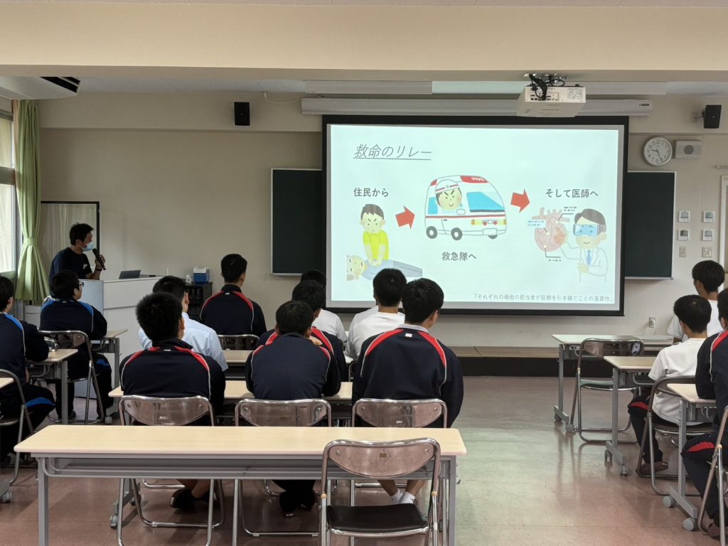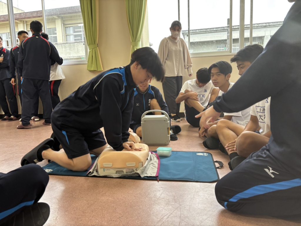 2025.10.24 有高News 10/22(水) 普通科スポーツ総合コース3年生、普通科キャリア総合コース2年生、福祉科2年生の3クラスを対象に救命講習会を開催しました。 有明広域行政事務組合消防本部様より5名の講師の方に来ていただきました。 生徒は皆、心肺蘇生法からAEDの使用方法までの実技に真剣な眼差しで取り組んでいました。 講師の皆様、本日はありがとうございました。