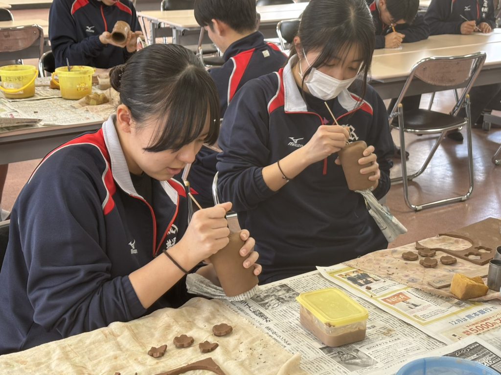 2026.01.22 部活&学科Topics 1月21日に普通科3年生が荒尾市社会福祉事業団の方々からご指導いただき陶芸制作に臨みました。コップやお皿、小物入れなど慣れない作業に戸惑いながら制作しました。 出来上がった作品は、卒業式に届くことになっています。