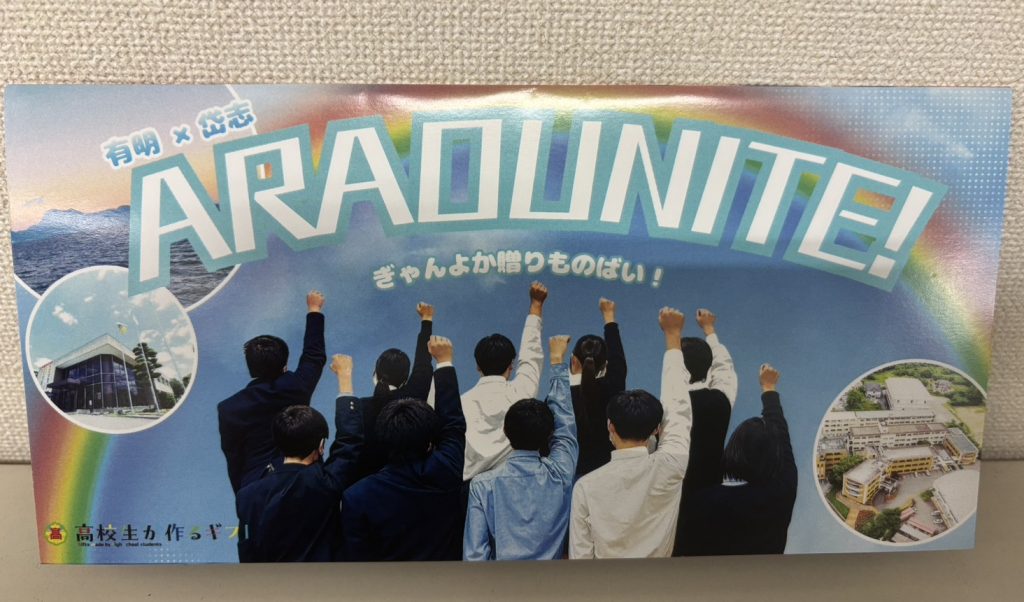 2026.02.05 部活&学科Topics 有明高校、岱志高校合同で取り組んでいる事業で完成したカタログギフト「ARAOUNITE」完成報告会を開催しました。 当日は、掲載商品事業者の皆さまをはじめ、ご協力いただいた企業、市役所関係者、報道各社の方々にもご出席いただきました。 生徒から本カタログギフトが生まれた背景や、企画から制作に至るまでの具体的な取り組みや工夫した点について紹介しました。 本カタログギフトが、地域と人をつなぐきっかけとなることを願っています。